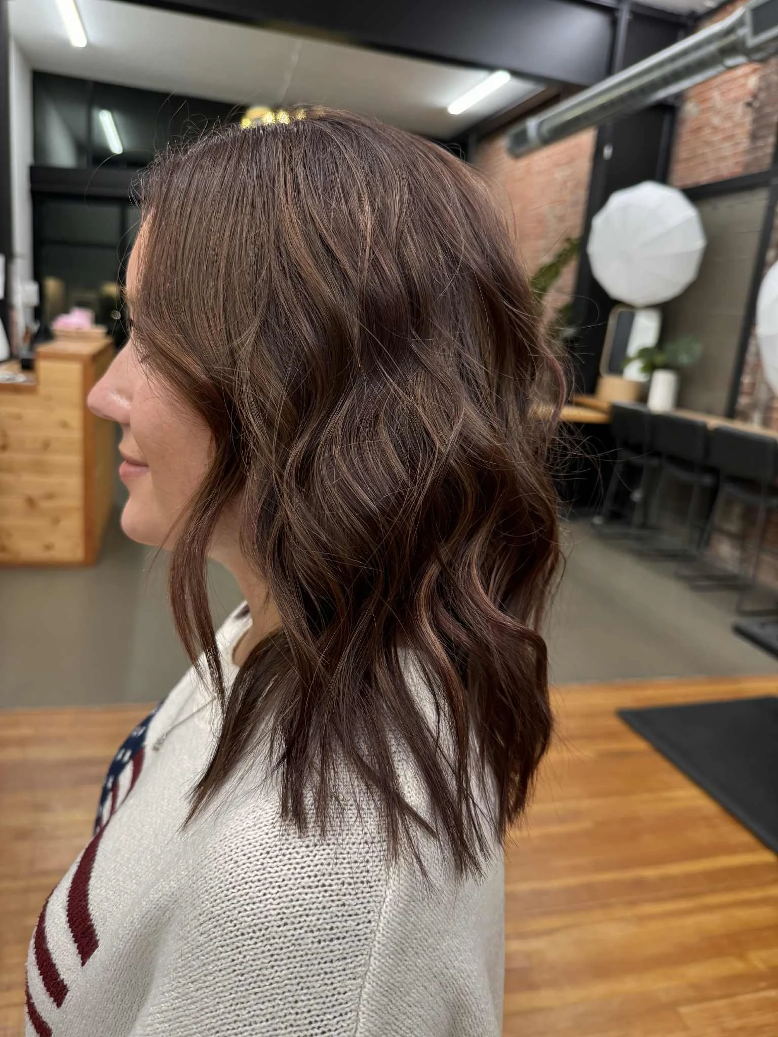 Dimensional service. Added depth to previously lightened hair. Great for clients who like going darker with the season or who would like a more low maintenance color.